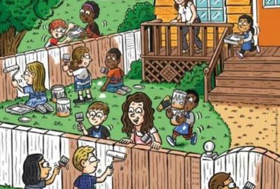 Na obrázku sú ľudia, ktorí natierajú plot pred domom. Každý z nich je zaneprázdnený nejakou činnosťou. Tvojou úlohou je nájsť mrkvu. Pozerajte sa veľmi pozorne, aby ste zeleninu našli.