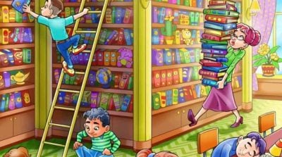 Na obrázku je zobrazená knižnica s knihami na policiach. Žena prináša nové knihy a muž drží knihu na polici pomocou rebríka. Deti študujú, niektoré z nich hrajú stolové hry.