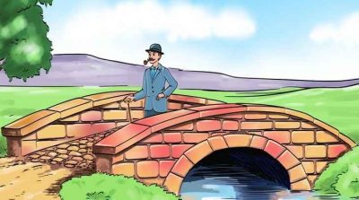 Na obrázku vidíme muža v obleku, klobúku a s palicou, ktorý kráča po moste. Okolo neho sú zelené polia. Neďaleko rastie strom a tečie rieka.