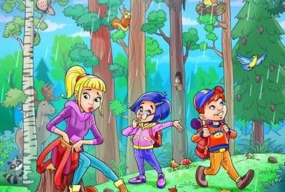 Na obrázku je zobrazený les, v ktorom mama a jej dve deti zrejme hľadajú dáždnik. Hľadanie pozorne sledujú lesné zvieratá. Našou úlohou je nájsť dáždnik.