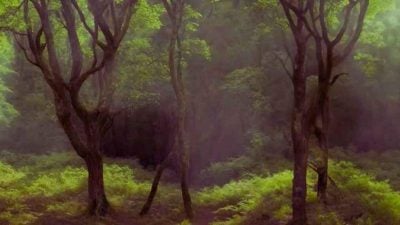 Na obrázku – hustý les, v ktorom sú dva stromy, na ktorých nie sú takmer žiadne listy. Niekde tu, medzi stromami, sa ukrýva jeleň.